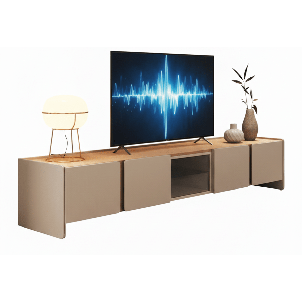 TV stand with structural curved edges, combined with four doors and two interior drawers that contrast with inlaid metal details.