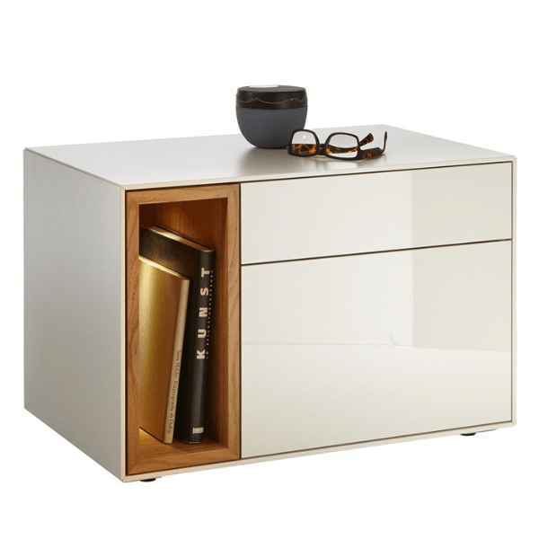 The IVANA Commode is an exceptional piece where art meets functionality, specifically designed for those seeking distinction in bedroom details. This nightstand stands out with a contrast design that blends a high-gloss finish with the warmth of natural wood.