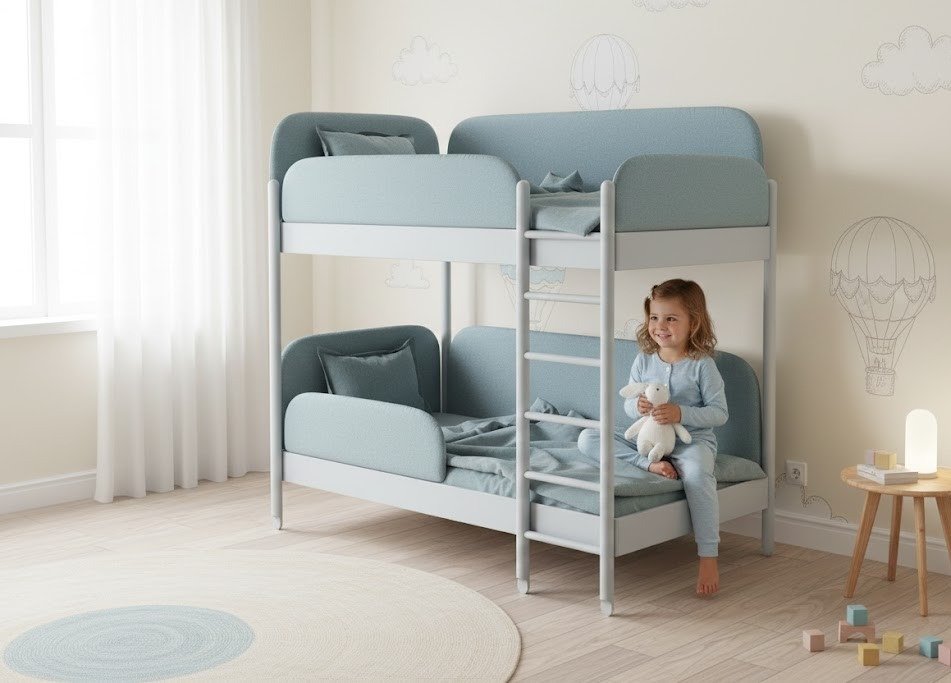With its two generous levels and fully upholstered fabric structure, the LILAO double bunk bed goes far beyond a simple sleeping solution. It creates two distinct, reassuring, and comfortable sleeping spaces, allowing each child to enjoy their own private world. Its enveloping design, combined with clean Scandinavian-inspired lines, delivers a cozy cocoon-like feel while intelligently optimizing space. The integrated ladder provides easy and secure access to the upper bunk without compromising aesthetics, making LILAO an ideal choice for shared bedrooms or spaces where functionality and design must coexist harmoniously.